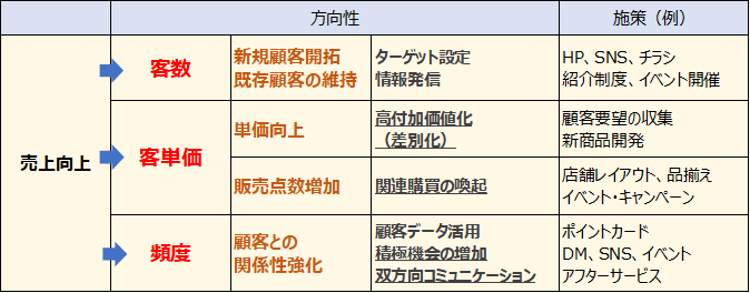 ちなみに「客数」「客単価」「頻度」の観点でマーケティング施策(例)をまとめると以下の通りとなります。